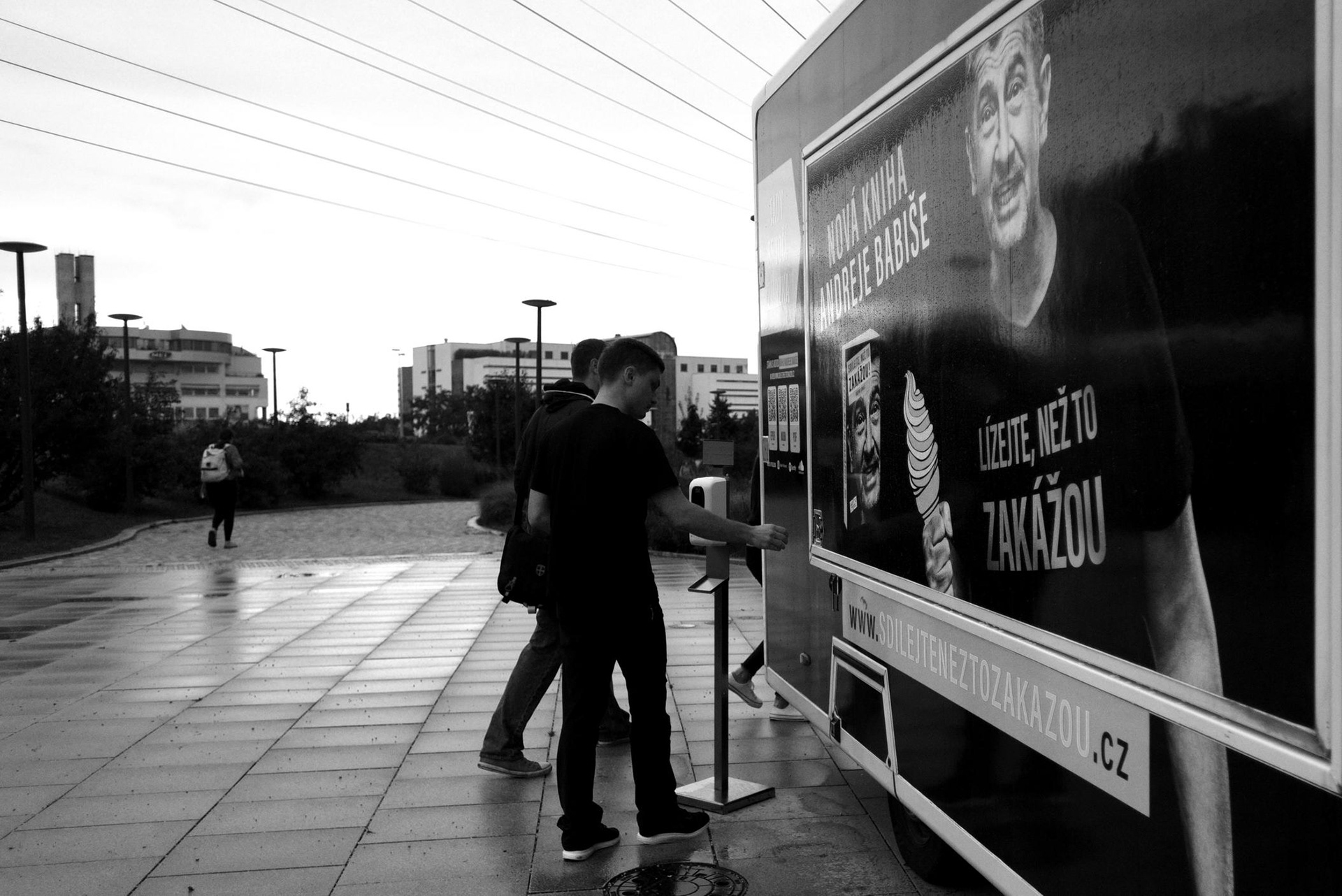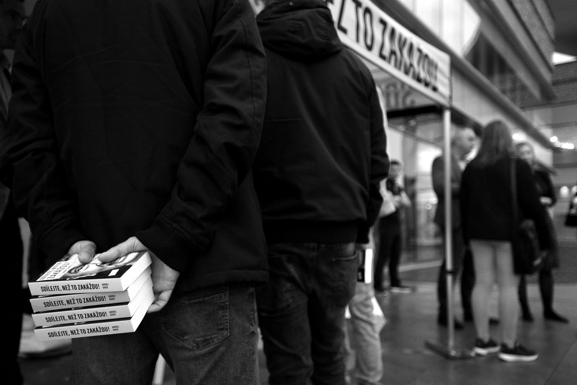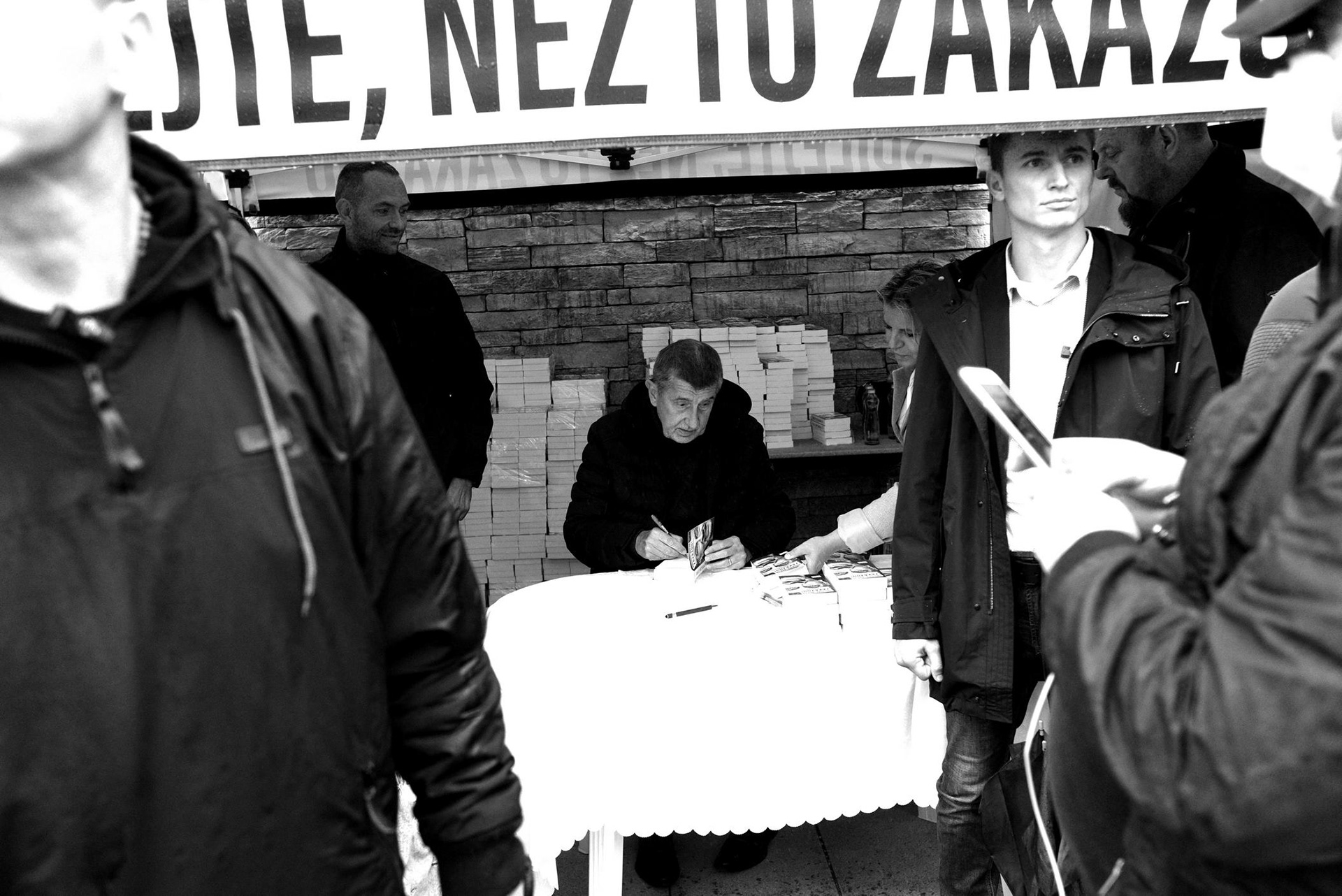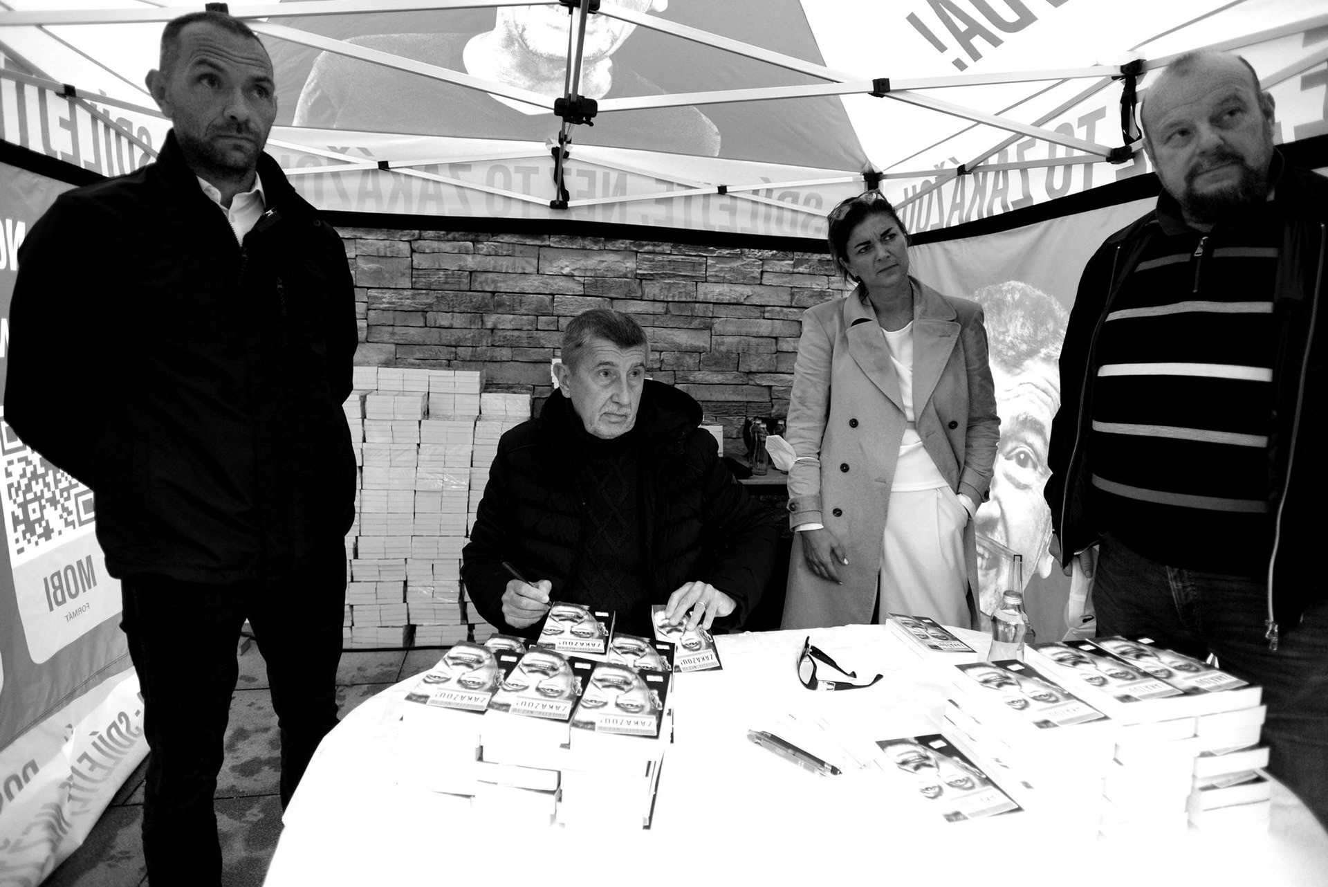 Premier Andrej Babiš, signing his book, attracted only a small group of his followers, almost the same number of his opponents and an equally large group of security men. The event was closed prematurely due to rain and low attendance