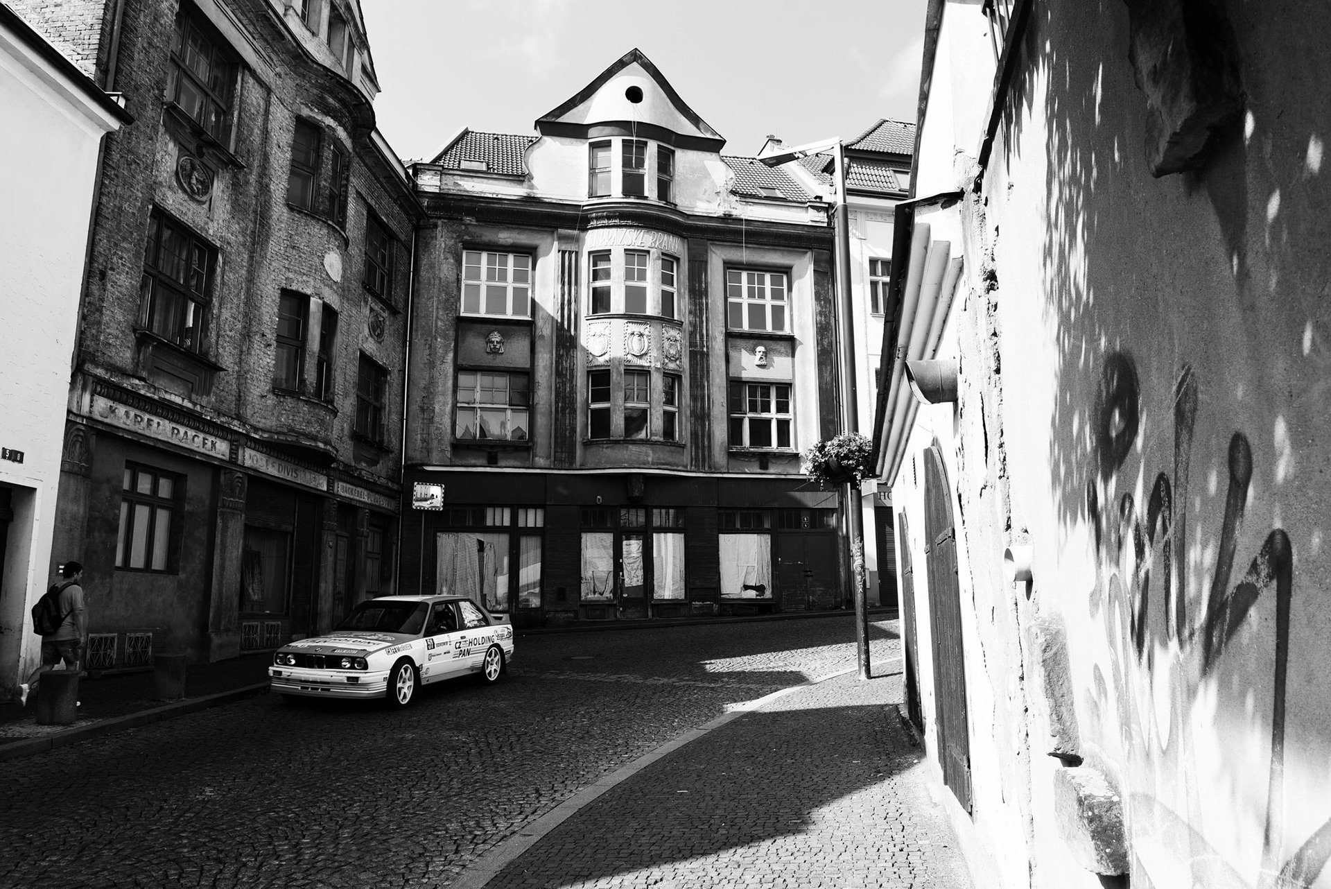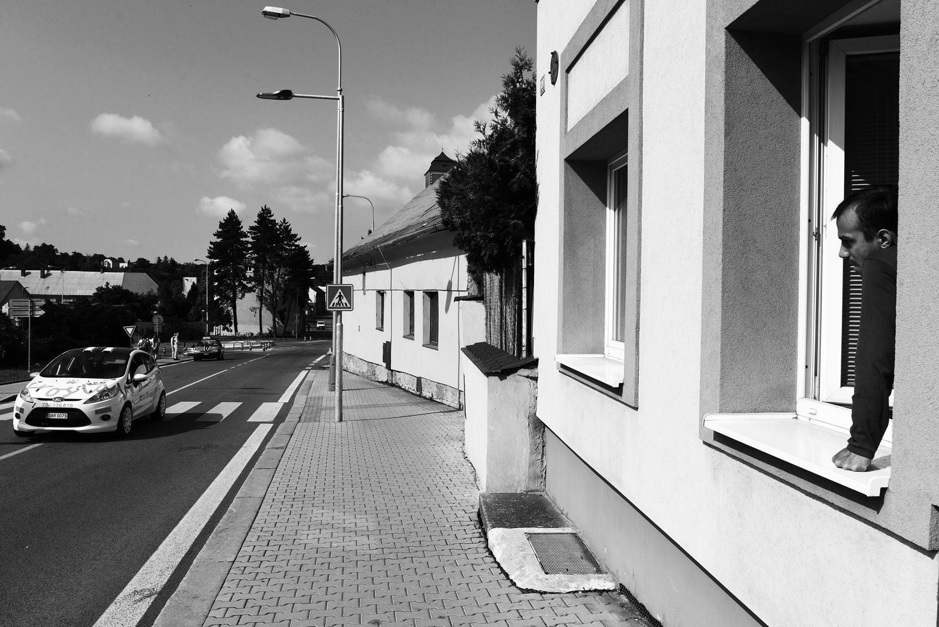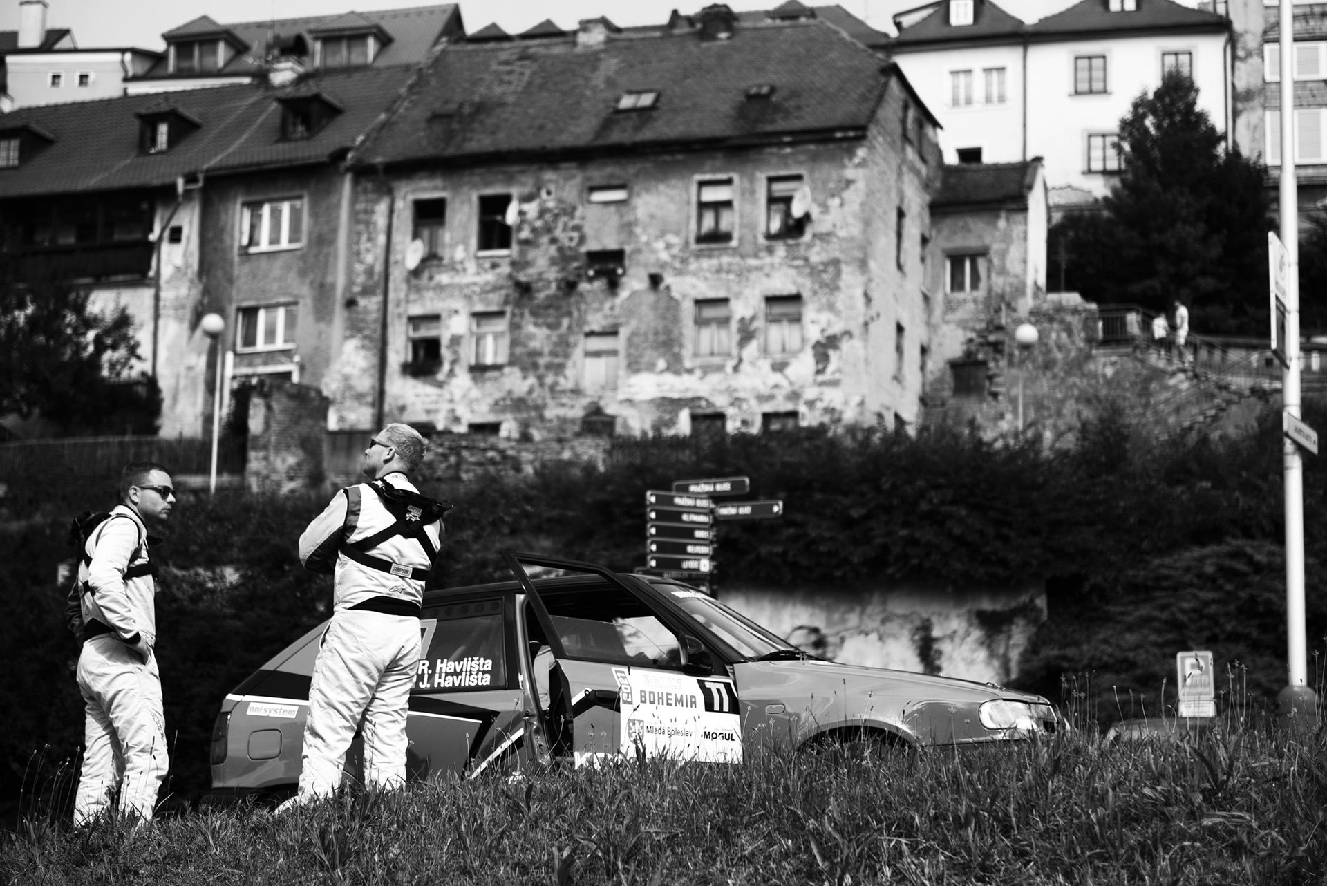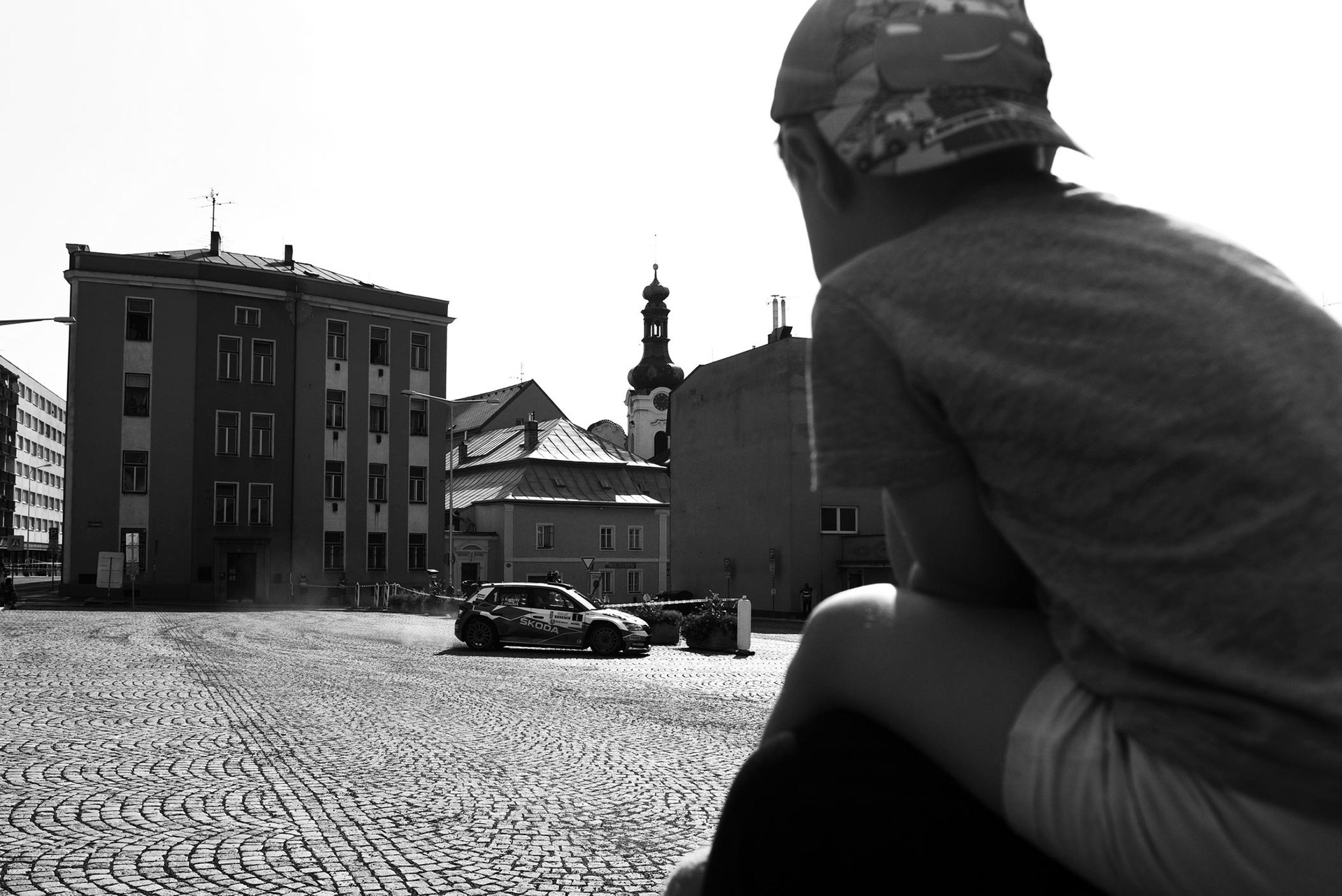 Racing cars pass through the historical centre of Mladá Boleslav and are watched by the locals